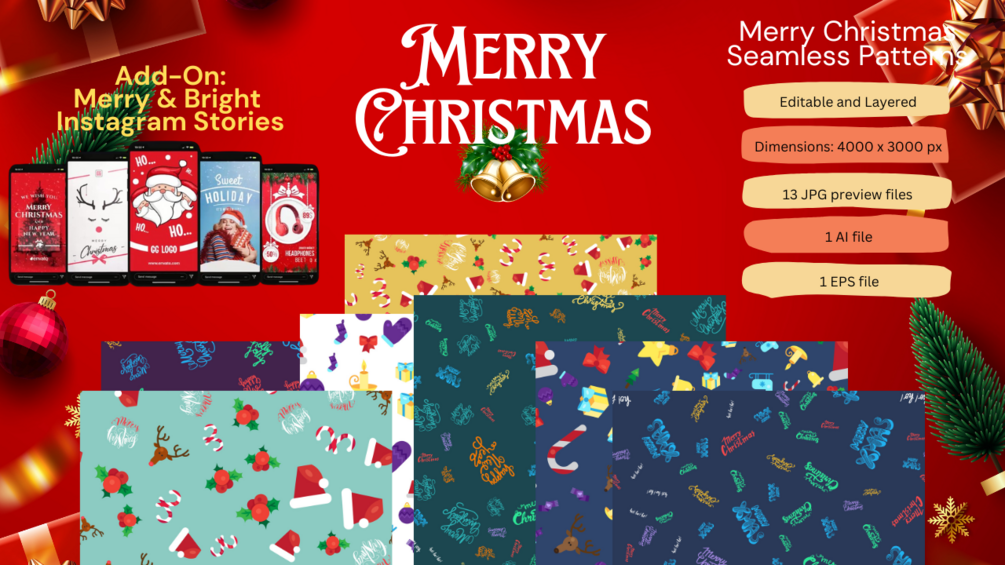 Whether youโ€™re designing static print materials or dynamic social media content, the Merry Christmas Seamless Patterns combined with the Merry & Bright Instagram Stories ensures your projects shine with holiday cheer and creativity.